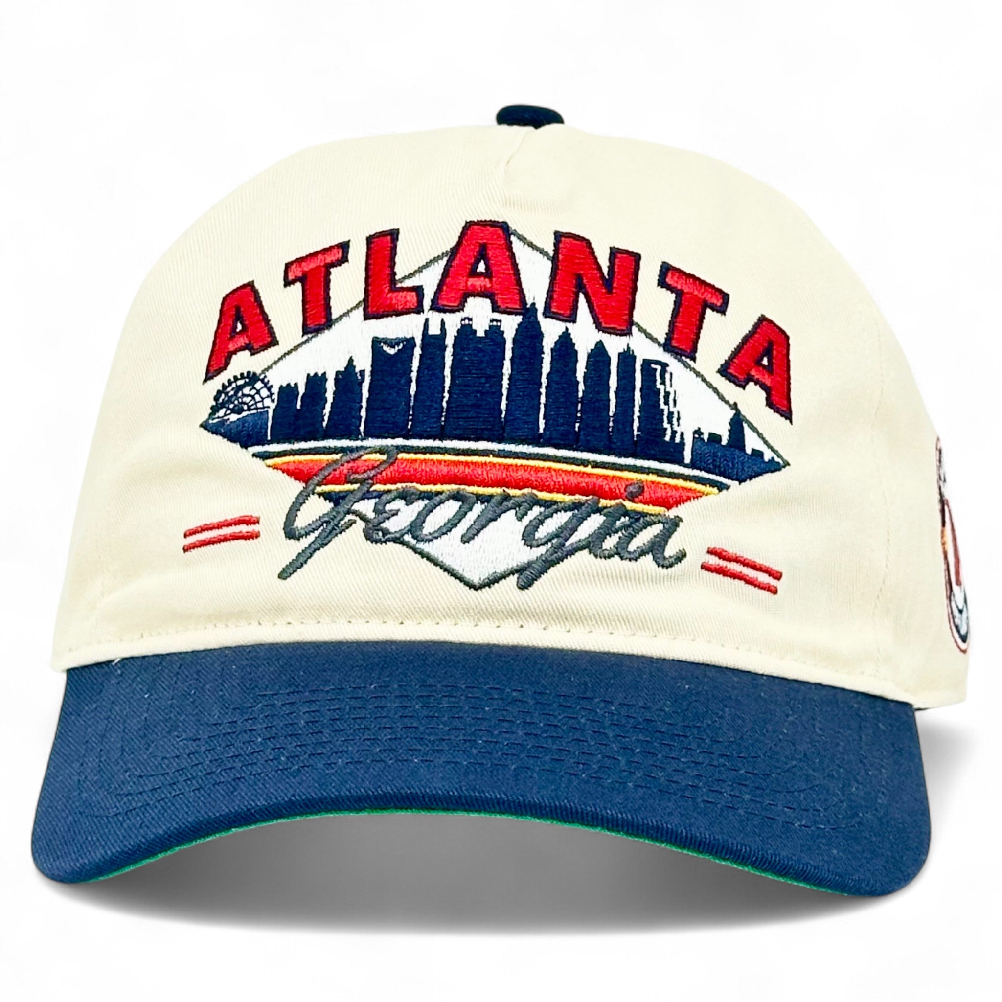 Clean ATL design with Braves-inspired font work against the cream crown. City skyline keeps it classic while that vintage-inspired patch rides the side.